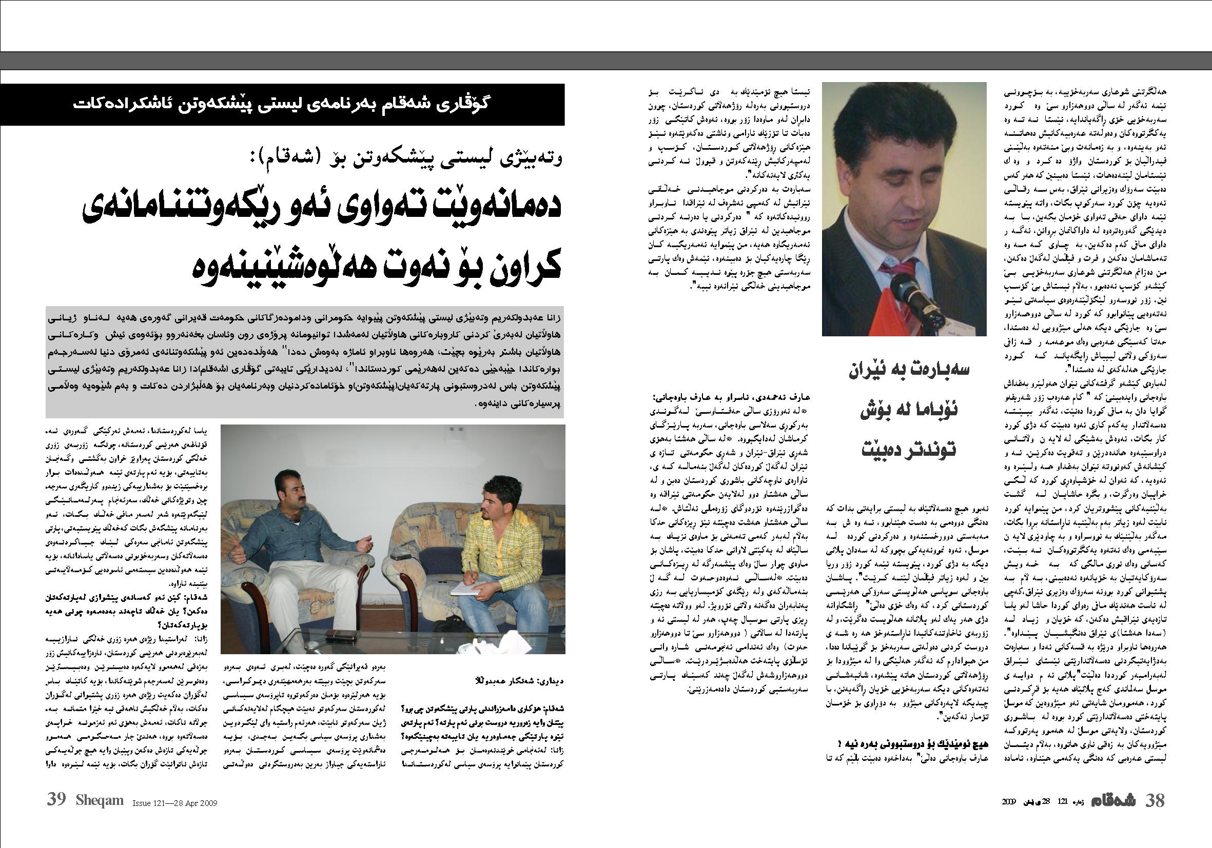 عارف باوهجانى: بۆ گۆڤاری شهقام دهدوێت. نابێت لهوه زياتر چيتر کورد به بهڵێنه نارإاستهکانى بهغدا برإوا بکات