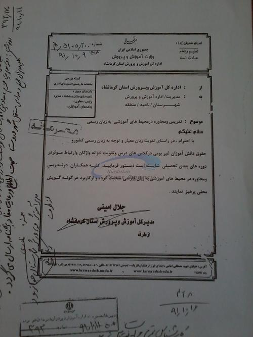 بەڕێوەبەرایەتی پهروهردهی کرماشان، قوتابخانهکانى پارێزگاى کرماشانى ئاگادار کردووهتهوه لهکاتى وانهگوتنهوهدا نابێت کهڵک له زمانى کوردى وهربگیرێت.