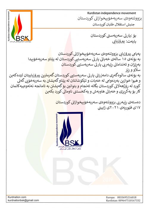 پەیامی پیرۆزبایی بزووتنەوەی سەربەخۆییخوازانی کوردستان بە بۆنەی 15 ساڵەی خەباتی پارتی سەربەستیی کوردستان لە پێناو سەربەخۆییدا