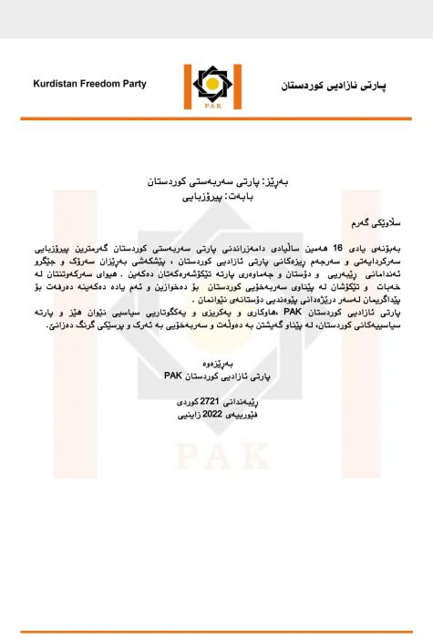 ساڵیادی دامهزراندنی پارتی سەربەستی کوردستان گهرمترین پیرۆزبایی سەرکردایەتی و سەرجەم ڕیزەکانی پارتی ئازادیی کوردستان ، پێشکەشی بهڕێزان سەرۆک و جێگرو ئەندامانی ڕێبەریی و دۆستان و جهماوهری پارتە تێکۆشهرهکهتان دهکهین . هیوای سەرکەوتنتان لە خەبات و تێکۆشان لە پێناوی سەربەخۆیی کوردستان بۆ دەخوازین و