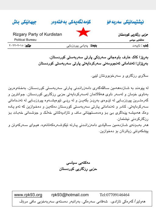 mso-bidi-language:#0492">لە پێوەند بە شازدەهەمین ساڵڤەگەڕی دامەزراندنی پارتی سەربەستی کوردستان، بەختەوەرین بەناوی خۆمان و لەسەر ناوی هەڤاڵانمان لەسەرکردایەتی حزبی ڕزگاریی کوردستان، جوانترین و گەرمترین پیرۆزبایی لە ئێوەی بەڕێز بکەین و لە ڕێی ئێوەیشەوە پیرۆزبایی لە ئەندامانی سەرکردایەتی، کادر و ئەندامانی پارتی سەربەستی کورستان دەکەین و دەخوازین کە ئەم یادە وەک هەمیشە پێداگری بێ بۆ وەدەستهێنانی ماف و ئازادیەکانی خەڵک و جۆشدانی خەبات بۆ ڕزگارکردنی نیشتمان.