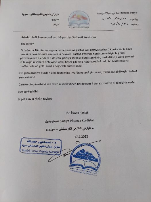 Bi helkefta 16-mîn salvegera damezrandina partiya we, partiya Serbestî Kurdistan, bi navê xwe û bi navê komîta navendî û hevalên partiya PêÅŸenga Kurdistan- sûriyê, bi germî pîrozbaya we û endam û dostên partiya serbestî kurdistan dikin, serkeftinê ji were dixwazin di têkoÅŸîn û xebata netewîde wekû beÅŸek ji bizava rizgarîxwazîa kurd , bo bedestxistina mafên netewî gelê kurd li Rojhelatî Kurdistande.